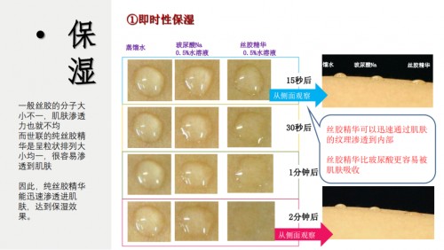 保湿力——比玻尿酸更快速渗透保湿,因为丝胶里含的氨基酸(丝氨酸、甘氨酸、苏氨酸)与肌肤的保湿成分NMF(天然保湿因子)非常相似。这是丝胶独有的特征。纯丝胶精华是与肌肤天然保湿因子最接近的保湿成分。