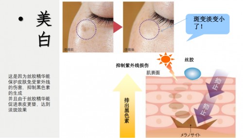 美白——丝胶精华可以阻碍络氨酸酶活性阻碍黑色素;抑制急性紫外线(UVB)引起的肌肤问题(紅斑)抑制黑色素的生成,并且由于丝胶精华能促进表皮更替,可以达到淡斑的效果。