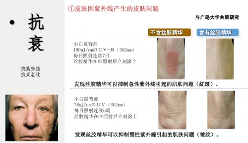 抗衰——紫外线uva会直接射进肌肤的真皮层导致肌肤光老化,纯丝胶精华可以抑制慢性紫外線(UVA)引起的肌肤问题(光老化),能使细胞活化,促进胶原蛋白产生。