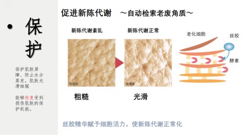 修护——丝胶可以自动检索老废角质,促进新陈代谢,保护肌肤屏障、防止水分蒸发,促使肌肤重新焕发光滑细腻;可以提升肌肤免疫力,恢复细胞新生力,帮助皮肤恢复受到损伤肌肤的保护机能,达到到健康的状态。