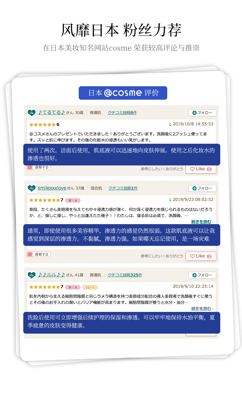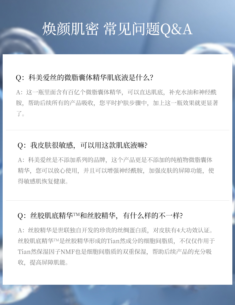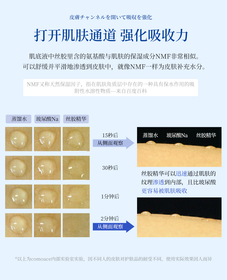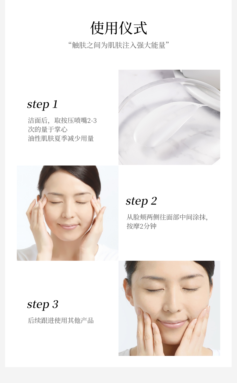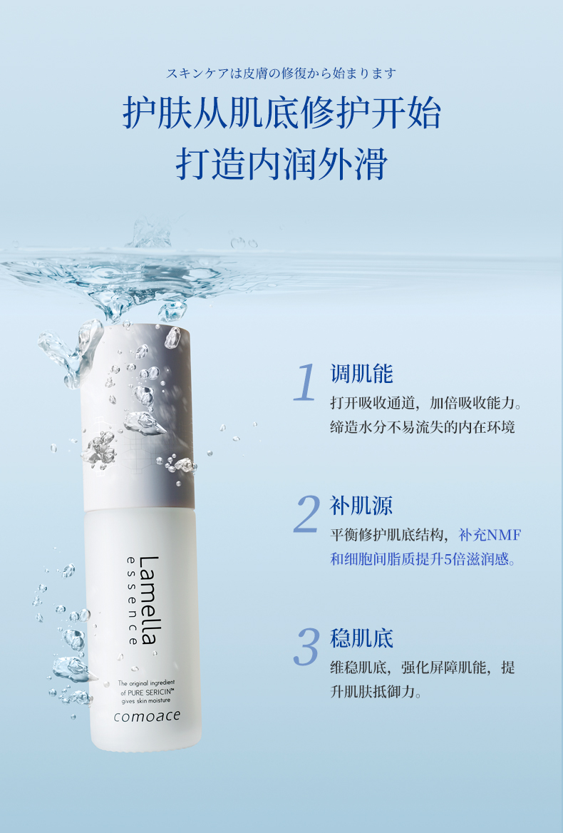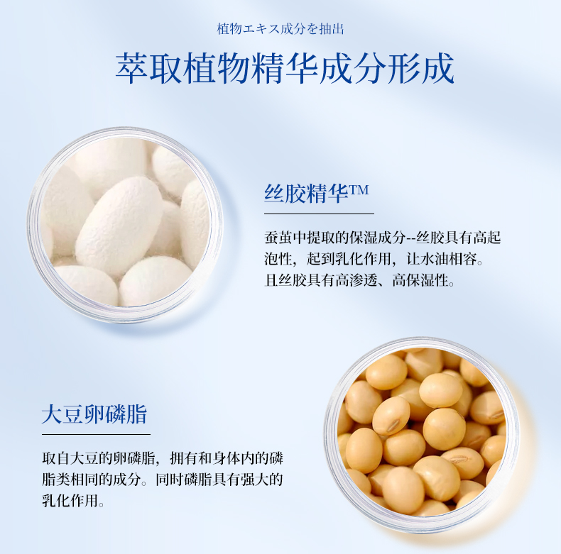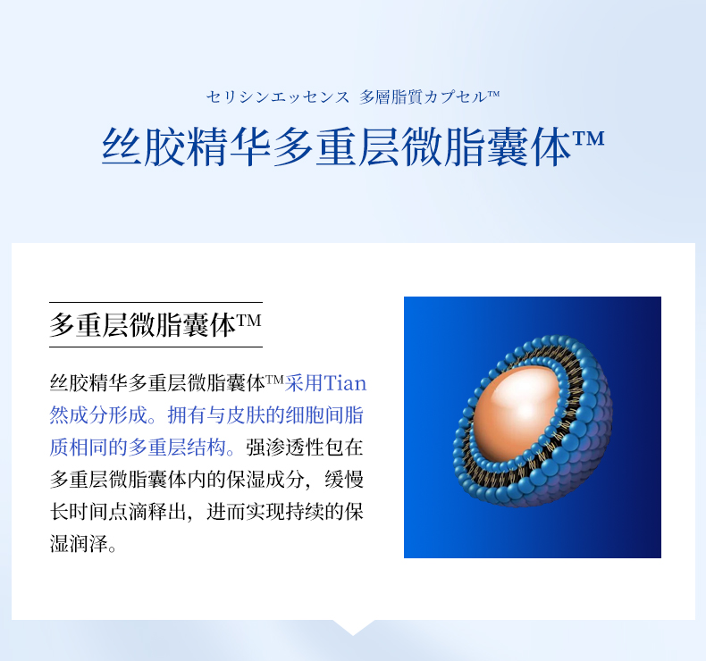 丝胶精华多重层微脂囊体采用天然成分形成。拥有与肌肤角质层(细胞间脂质)的细胞膜构造相同的多重层结构。强渗透性包在多重层微脂囊体内的保湿成分,仅含天然成分的导入型精华肌底液,浸透角质层、打造水润光泽富有弹力的肌肤。
