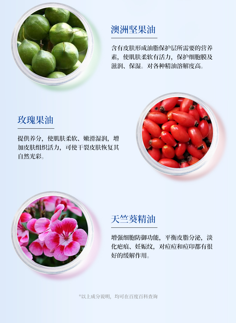 纯丝胶精华、大豆卵磷脂、澳洲坚果油、玫瑰果油、天竺葵精油