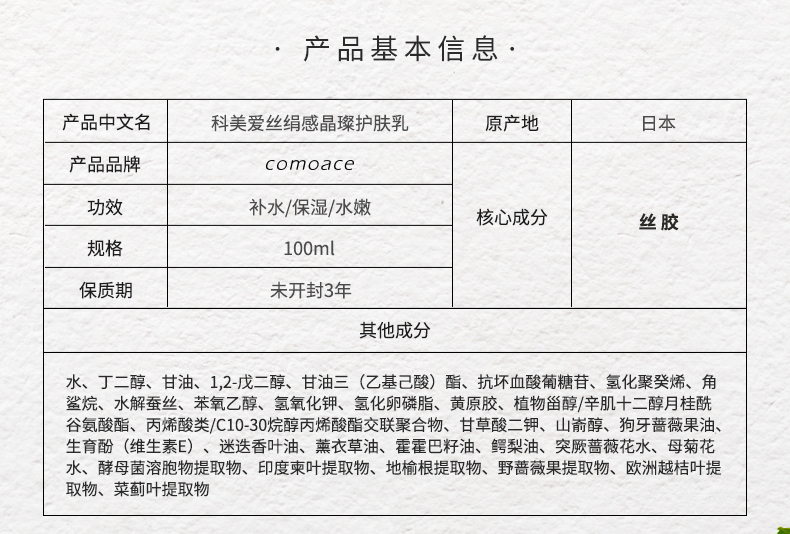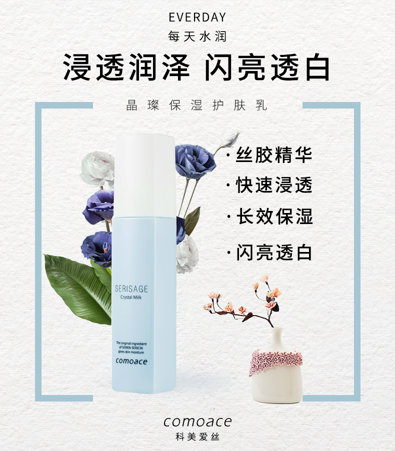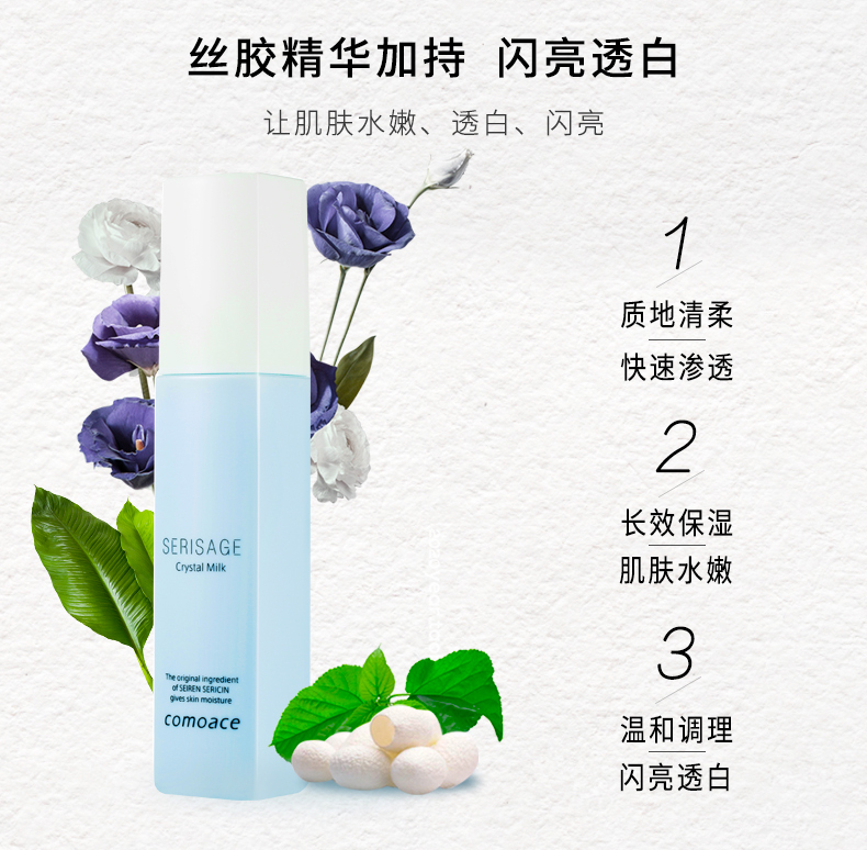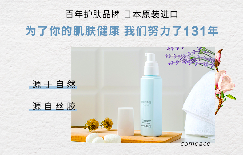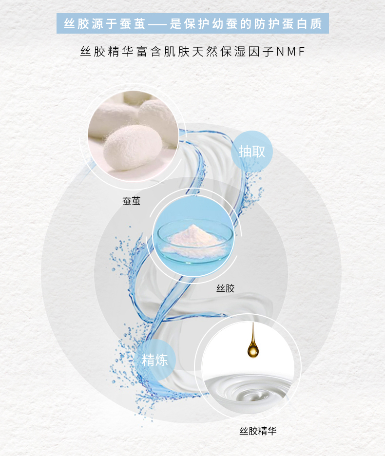 自古以来素有“纤维王国”美称的福井县是日本少有的纤维织物产地之一。而世联集团亦是1889年起步于此,开启了纤维产业,并历经了百余年的岁月变迁。在日复一日年复一年的丝绸精炼过程中,世联惊奇的发现,即使在寒冷干燥的气候下,丝绸工人的双手依然光滑白皙。为了解开这一奥妙,世联终于在耗时数年的研究中找到了答案。之所以丝绸工人能在严寒及高强度工作中,依旧保持双手光滑白皙的秘诀,原因就在于蚕丝中所蕴含的一种自然美肌成分--丝胶。 纯丝胶精华具有良好水分保持能力。他富含的丝氨酸成分,含量高达30%,与苏氨酸组合后,拥有的氢氧基的氨基酸含量可达44%左右。由于该物质含有大量的氢氧基,纯丝胶精华的保湿性较好,可有效防