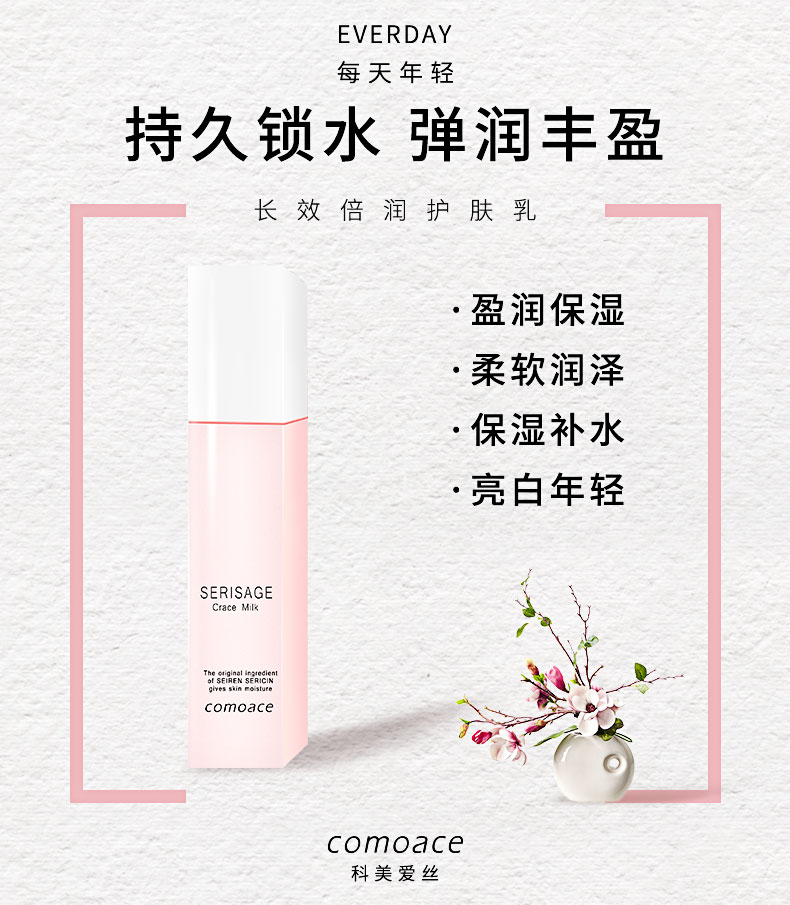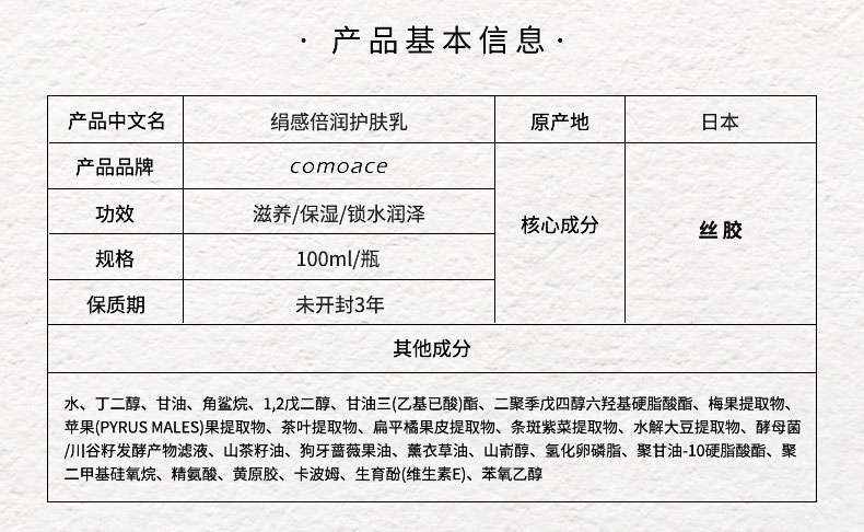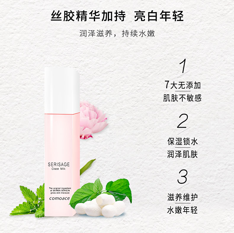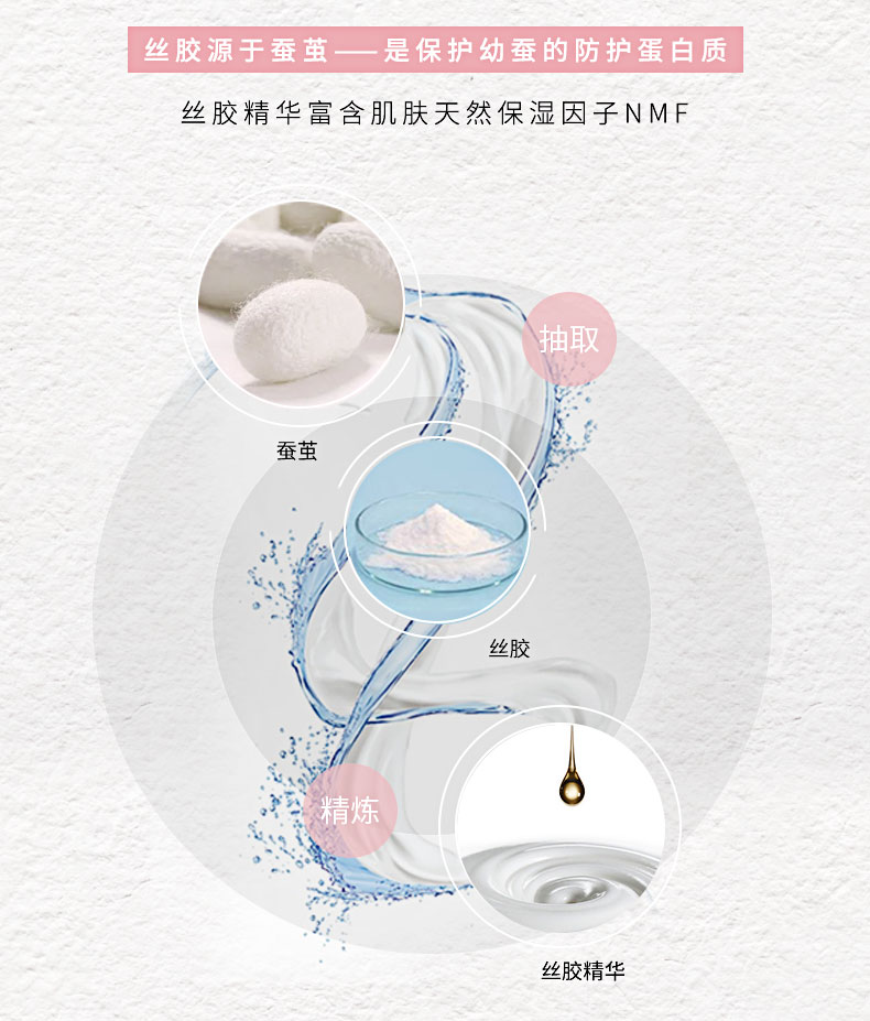 自古以来素有“纤维王国”美称的福井县是日本少有的纤维织物产地之一。而世联集团亦是1889年起步于此,开启了纤维产业,并历经了百余年的岁月变迁。在日复一日年复一年的丝绸精炼过程中,世联惊奇的发现,即使在寒冷干燥的气候下,丝绸工人的双手依然光滑白皙。为了解开这一奥妙,世联终于在耗时数年的研究中找到了答案。之所以丝绸工人能在严寒及高强度工作中,依旧保持双手光滑白皙的秘诀,原因就在于蚕丝中所蕴含的一种自然美肌成分--丝胶。 纯丝胶精华具有良好水分保持能力。他富含的丝氨酸成分,含量高达30%,与苏氨酸组合后,拥有的氢氧基的氨基酸含量可达44%左右。由于该物质含有大量的氢氧基,纯丝胶精华的保湿性较好,可有效防止皮肤出现干燥现象。
